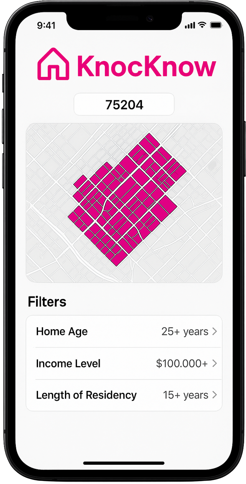 After six years of knocking doors, we faced every rep's nightmare: where the hell should I knock? Pure guesswork that wastes time and kills results.That's why KnocKnow was born. Choose your filters, pick your location, and we highlight the gold mines. Our AI learns where you close best and recommends your next winning neighborhoods.Stop guessing. Start dominating.